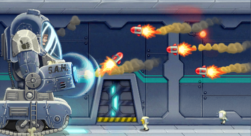 Основной элемент игры — реактивный ранец, который позволяет вам стремительно пролетать через уровни. Нажмите, чтобы взлететь, и отпустите, чтобы опуститься, избегая ракет, лазеров и электрических ловушек. Простое, но затягивающее управление делает игру доступной, но требует внимательности и реакции на высоких скоростях.