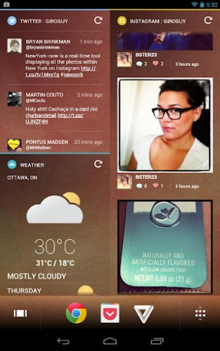 Простыми движениями установите на свой стол нужные встроенные виджеты. Они позволят быть в курсе событий, следить за новостями, погодой, новыми видео на ютубе, за сообщениями в твиттер и фейсбук акаунтах. Ваша рабочая поверхность на рабочем столе будет поделена на большие квадраты, на которые вы будете перетаскивать виджеты. Его можно растягивать, придавая ему больших и маленьких прямоугольных форм. Лаунчер Chameleon придаст вашему планшету неповторимости и неотразимой привлекательности, он поможет изменить обстановку и освежить ваш планшет, на который вы взглянете совсем по-новому.